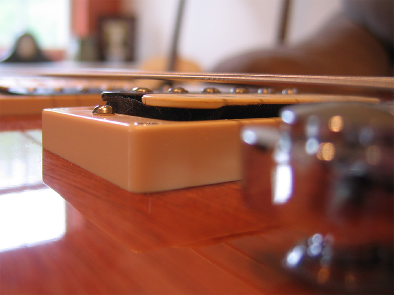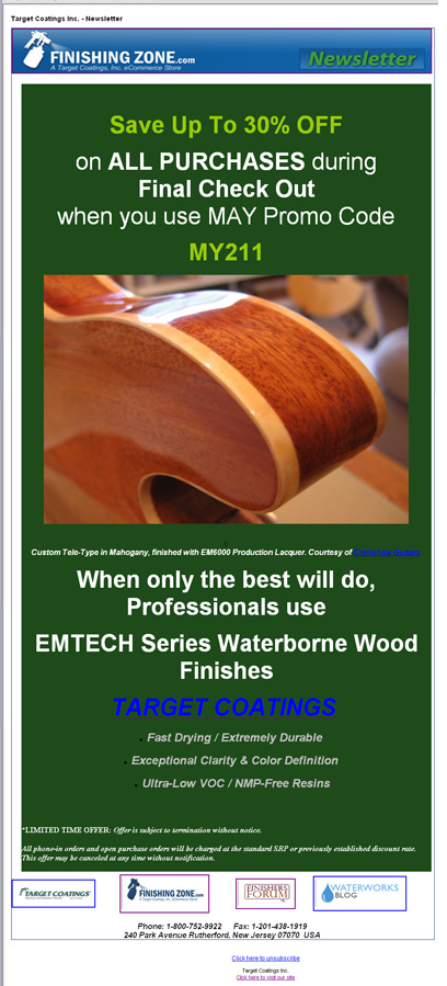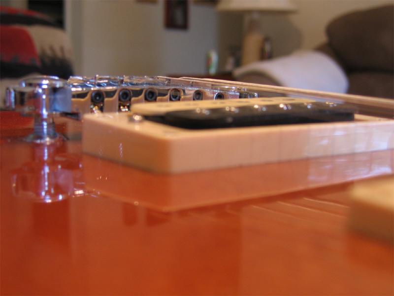The guitar is base coated in Tru-Oil for color, top coated with Target Coatings EM6000 waterbourne lacquer,