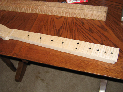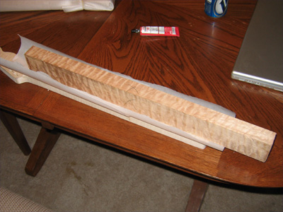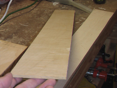 I resawed the fretboard from a flame maple billet...same on the neck came from. It is too thin to run through the planer by itself so I clamped the rest of the billet onto the planer bed to gain some height. Worked great!. I was able to take the fretbord stock down to just slightly thicker than .25". I left enough for radiusing and snading.