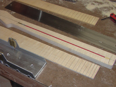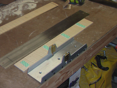 Using the fret miter box and saw from SM along with the fret scale template, I set up to cut the fret slots. This miter jig is a good idea but it is a bit less than user friendly. The 4 seperate height adjustments could really benifit from being mounting in slots to keep them perpendicular to the fence. I also didn't care for having to use double stick tape to hold the stock in place...there's gotta be a better way. It held it down fine but when it came time to remove it from the template, it took alot more force than I was sure the slotted stock could take. It came out fine but it was scary!