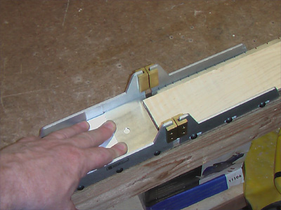 So, here's the full rig. The new plate rides along the "fence" and stops on either end set the length of the cut.