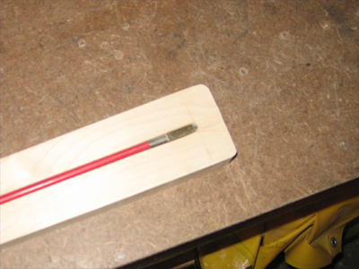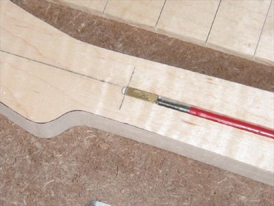 Here, I'm making the recess for the adjustment portion of the truss rod. Stew Mac sells a special router bit for their HotRod truss rods that is a perfect fit for the rod in the channel, however, the end of the rod doesn't fit through it. I had to widen it a bit with 100 grit to allow the allen socket to slide through and into place. No problem.