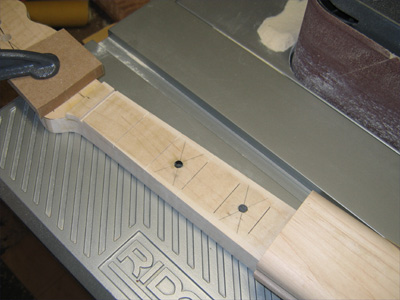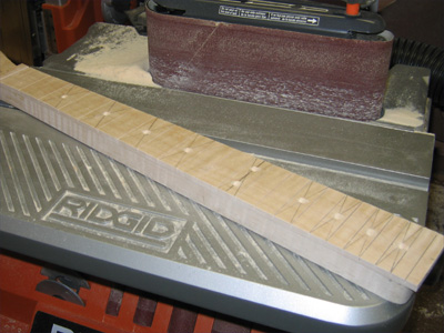 Then I moved on to profiling the fretboard to the neck. I could have used a router and pattern bit but I really like the control I have with the belt sander. Plus with the fretboard extending past the butt of the neck, I didn't want to risk the router slipping around a corner and cutting it off. The curves at the nut were delicate enough that I blocked them out by hand so I didn't get any tear out or split edges.