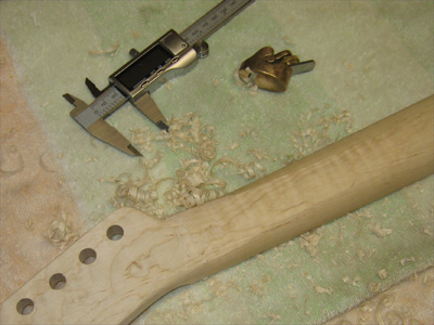 With the main profile roughed in, It's time to dial in the final feel of the neck. The choice here is a fairly thick C shape @ .895" up to the 12th fret that gardually tranitions into a flatter D shape @ .885" closer to the heel. I left both marks about .005" less than this at this stage leaving me room to sand later. I used digital calipers to check the thickness as I carved. This set of calipers has the reset switch right on the fron face where my had rested and it kept resetting...took me awhile to figure out how the display was changing even though I had the calipers locked off. So, I set my depth, locked them and shut 'em off. Problem solved.