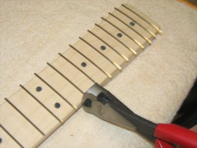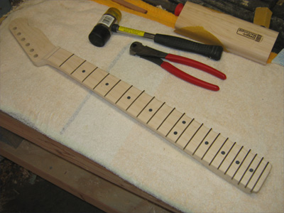 Nothing magical here. I over radiused the fret wire, cut it to legnth and tapped it in starting at the ends of the fret, then drove the center in. This keeps the ends of the wire from popping up. I tried to keep 8 or 10 frets cut ahead of me so I wasn't picking up the hammer 22 times...not that I mind the work, it just reduces the movement of heavy tools across the neck/fretboard...fewer chances of a bad tool transfer. I pass with nippers takes care of the extra wire and a quick touch up with a file along the edges of the fretboard helps protect my fingers until final leveling and dressing of the frets.
